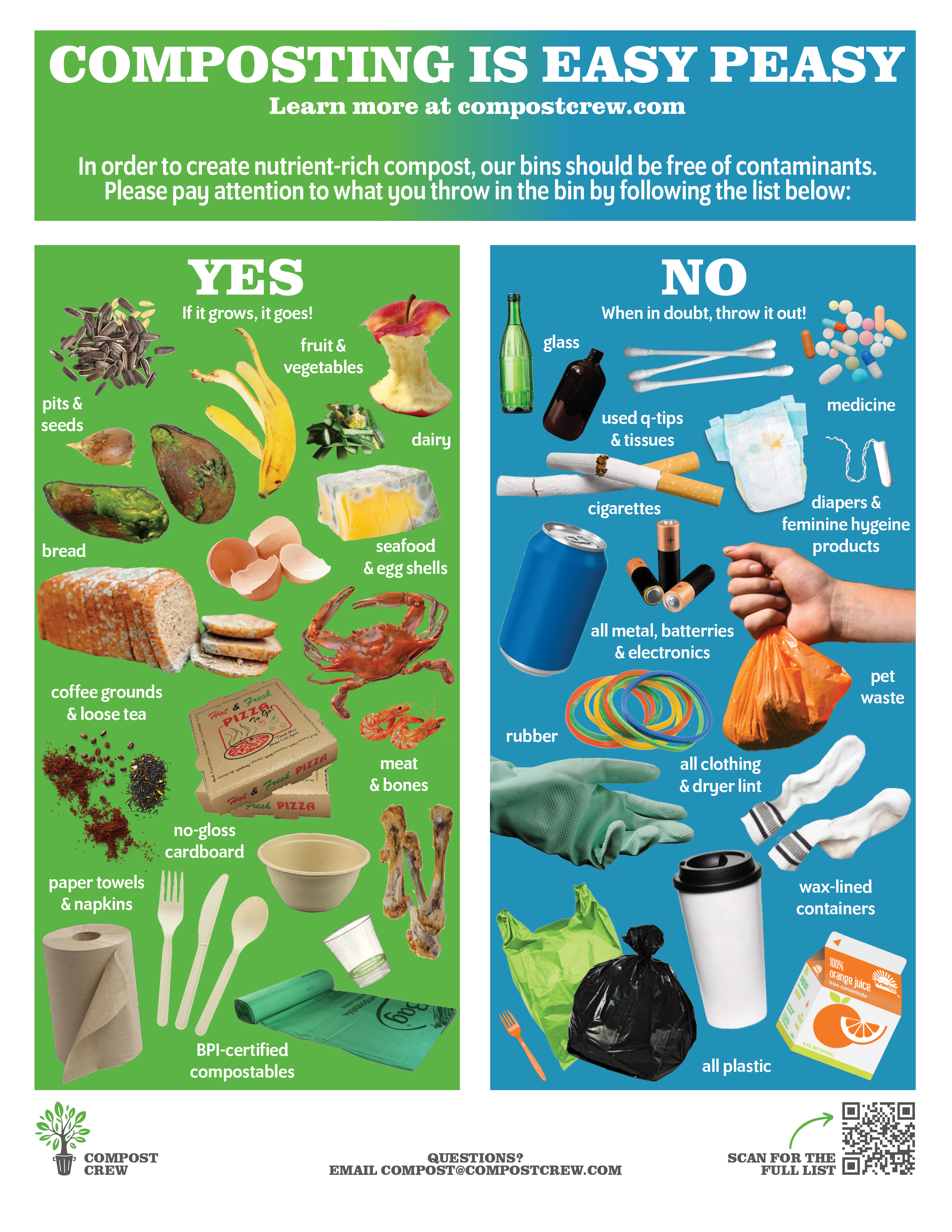 Aid us in creating nutrient-rich soil by following our our list of contaminants and accepted items! Download our full list or graphic list.